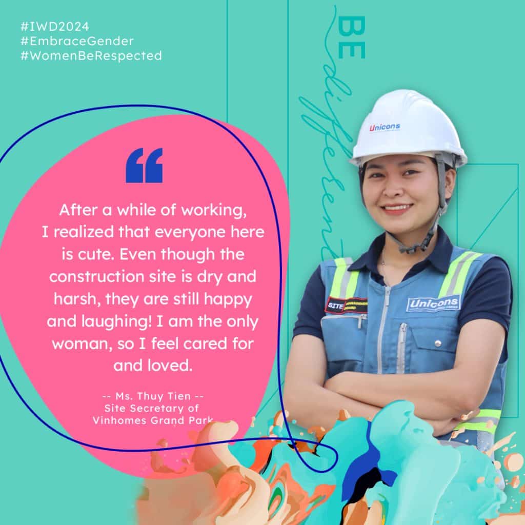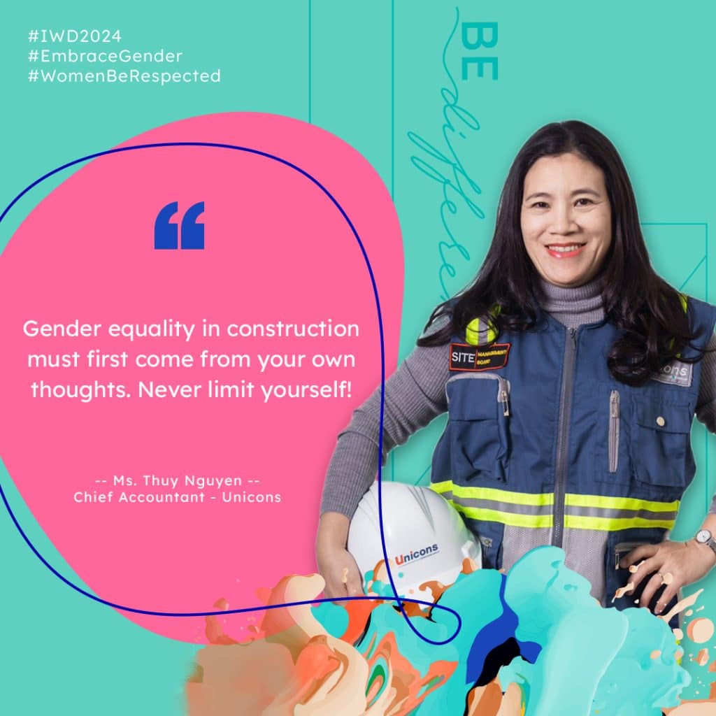 Ms. Nguyen Thi Thuy – Chief Accountant of Unicons: People are talking a lot about gender equality, in all industries, not just construction, but even women themselves think they cannot work in construction industry. So, gender equality in construction must first come from your own thoughts. Never limit yourself!