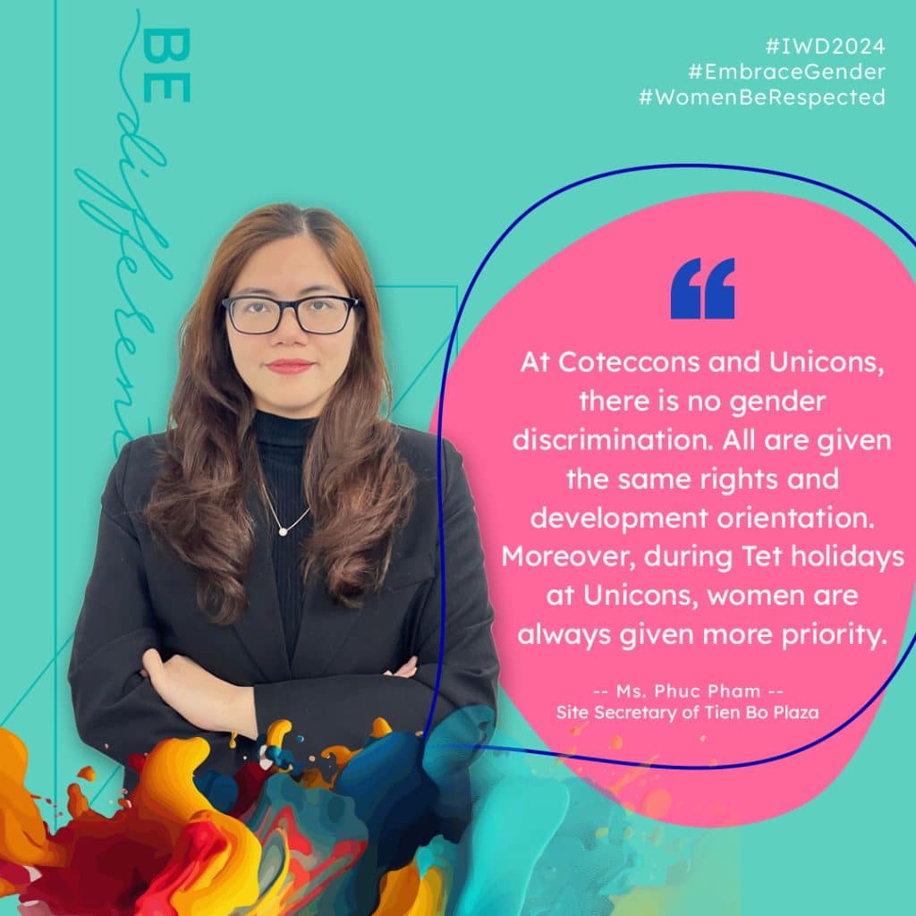 Ms. Pham Thi Phuc – Site Secretary of Tien Bo Plaza: In some current projects, women can also work as QS, QA/QC, Shop drawing, which used to be for men only… At Coteccons and Unicons, there is no gender discrimination. All are given the same rights and development orientation. Moreover, during Tet holidays at Unicons, women are always given more priority.