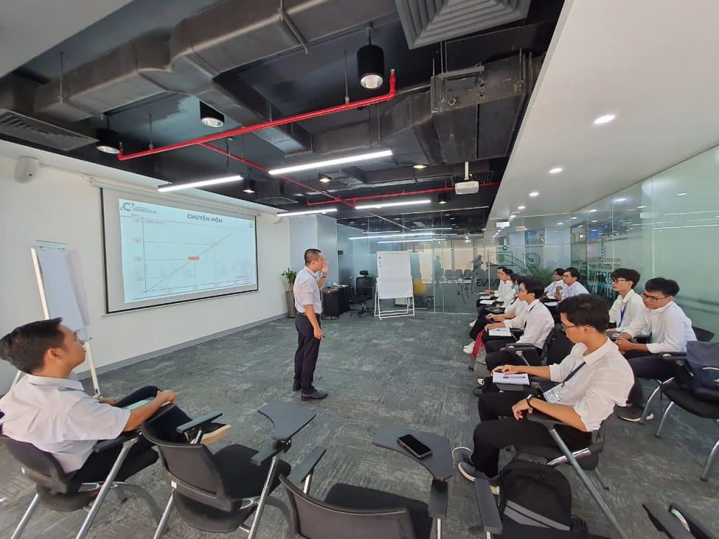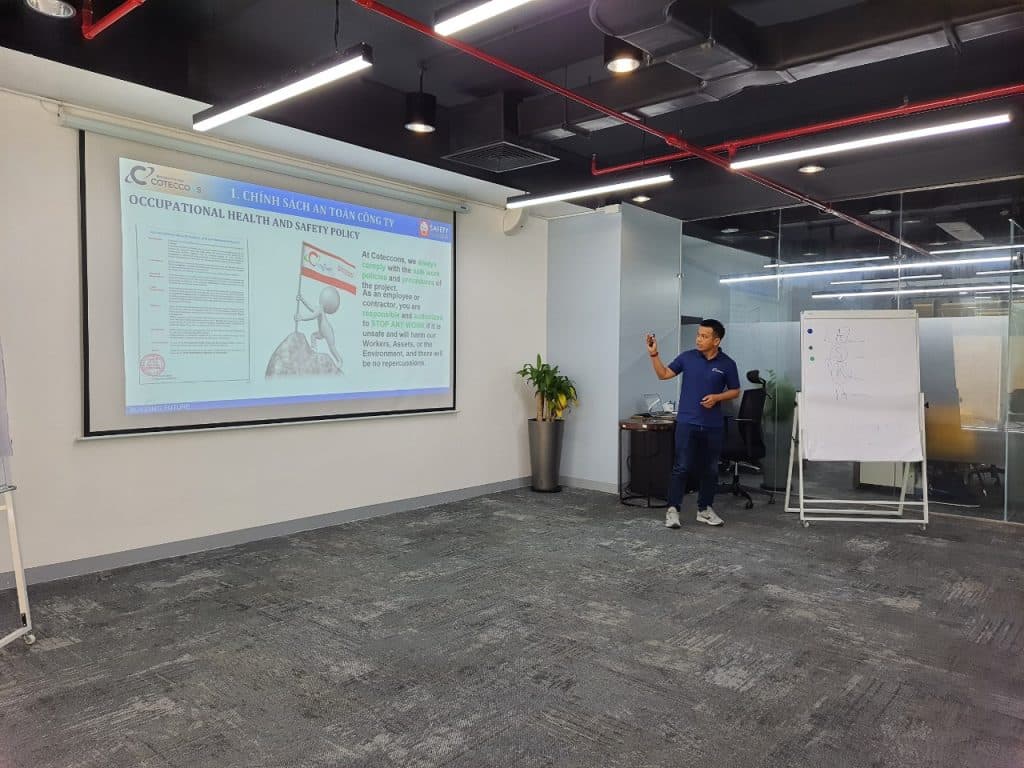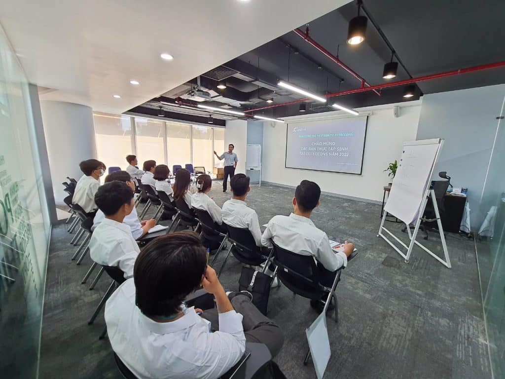 On June 7, 2022, the Department of Human Resources in collaboration with Coteccons Training Academy and the Safety Board held a meeting “Meet, share & train on occupational safety” to help the students better understand the Company, career path and more importantly, to equip themselves with knowledge about occupational safety before practice at the construction sites.