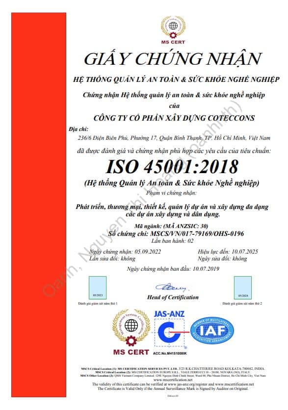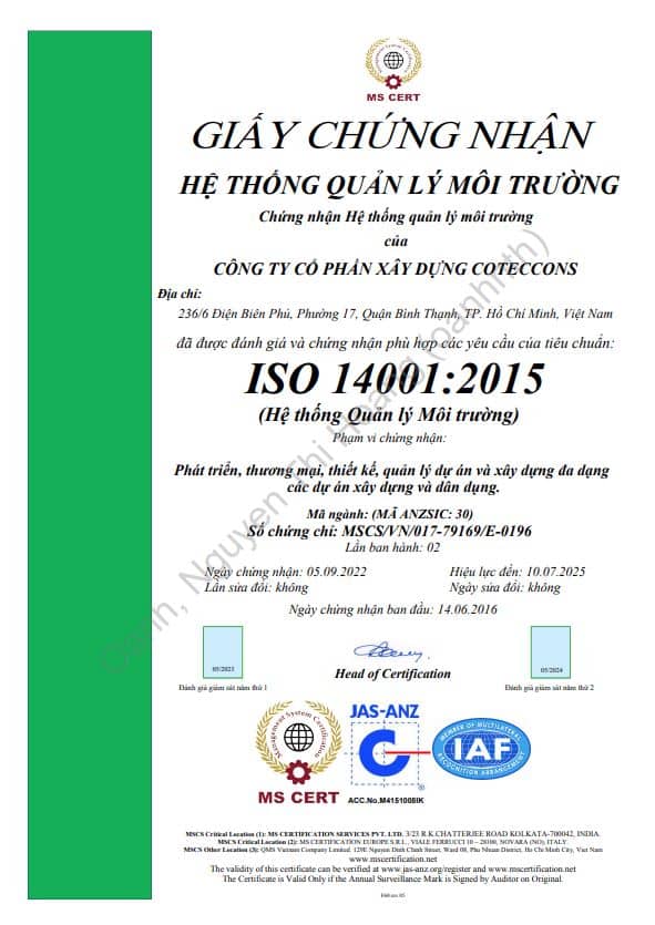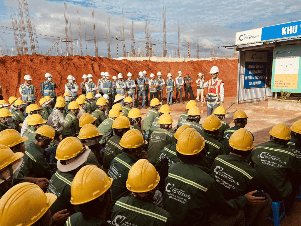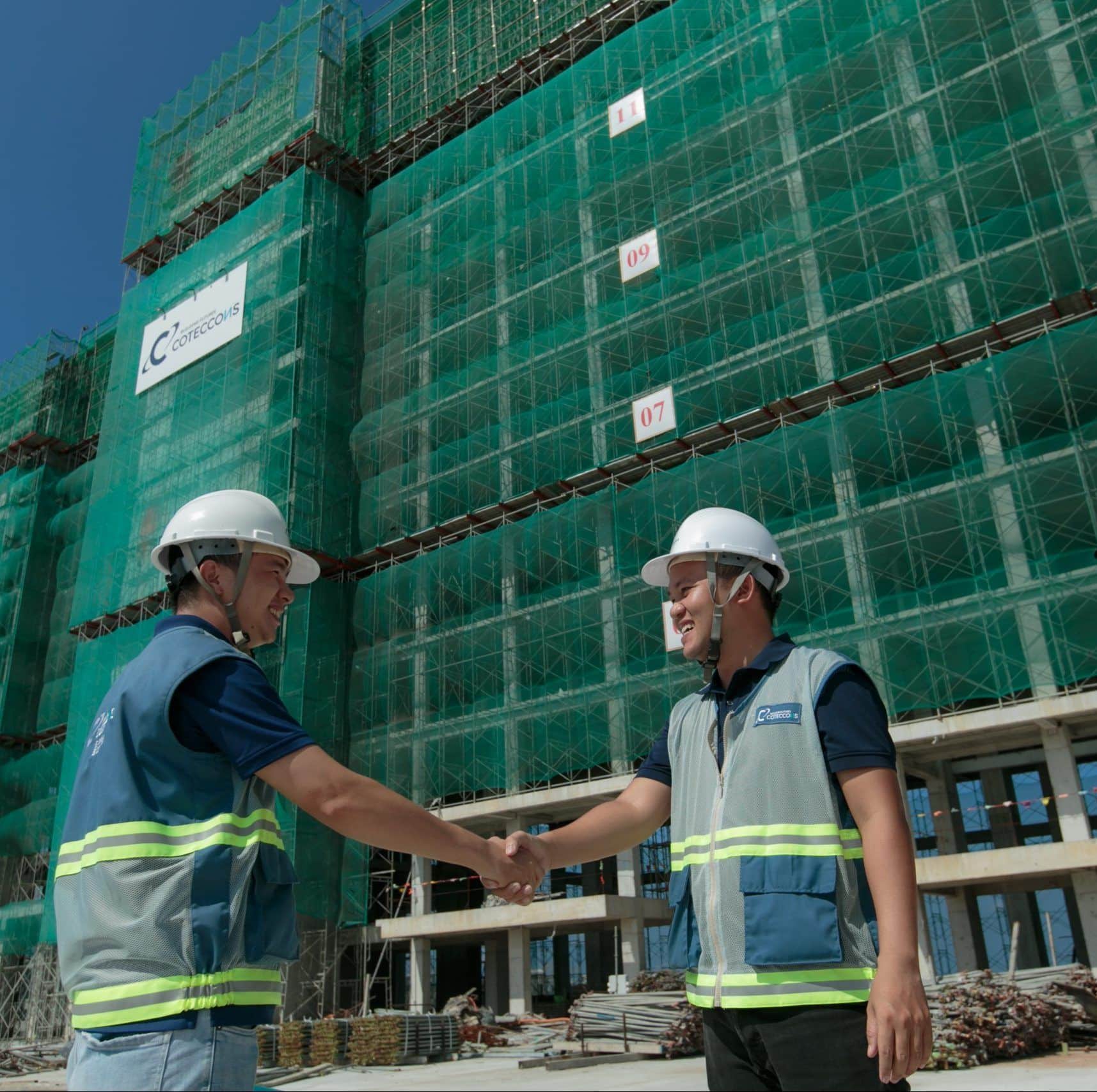 Đội ngũ HSE của chúng tôi với kinh nghiệm thực tiễn các dự án quy mô lớn trong nước và Quốc tế dẫn đầu toàn ngành với kỷ lục xuất sắc về số giờ lao động an toàn. Hệ thống kiểm soát an toàn tại Coteccons hoạt động theo tiêu chuẩn ISO 45001:2018 về Quản lý An toàn Sức khỏe Nghề Nghiệp và tiêu chuẩn ISO 14001 - 2015 về Quản lý Môi trường. Việc kiểm soát An toàn và Chất lượng được thực hiện nghiêm ngặt và định kỳ để đảm bảo an toàn và kiểm soát trong thi công:
