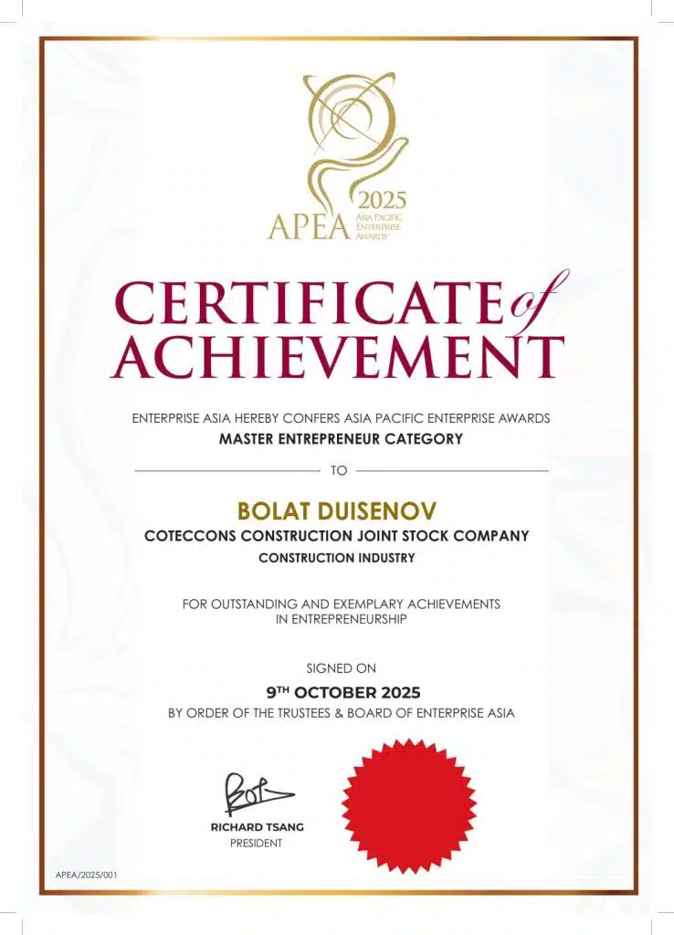 Tp. Hồ Chí Minh, ngày 9 tháng 10 năm 2025 – Công ty Cổ phần Xây dựng Coteccons (HOSE: CTD) tự hào thông báo Chủ tịch Hội đồng Quản trị – ông Bolat Duisenov đã được Enterprise Asia trao tặng danh hiệu Master Entrepreneur Award, một trong những giải thưởng uy tín hàng đầu khu vực vinh danh các doanh nhân xuất sắc.