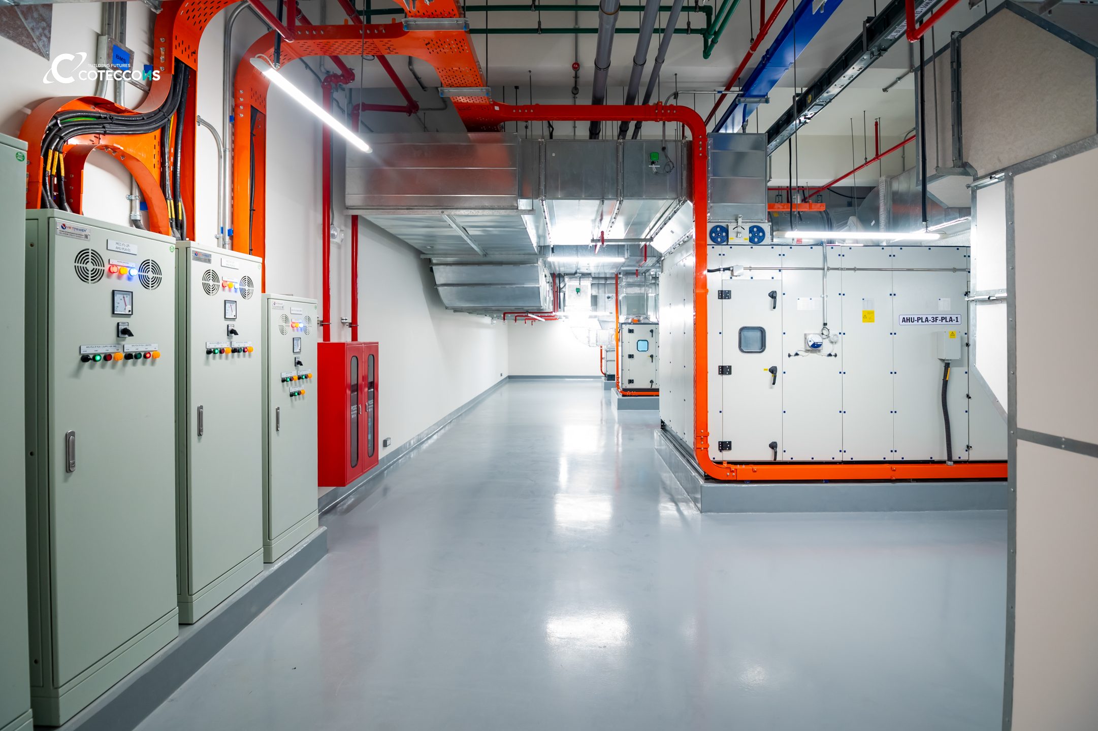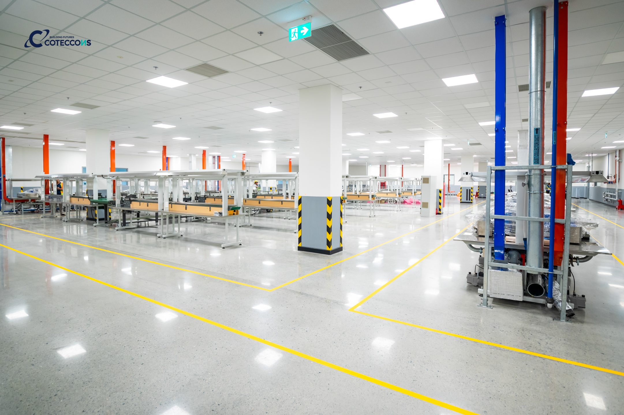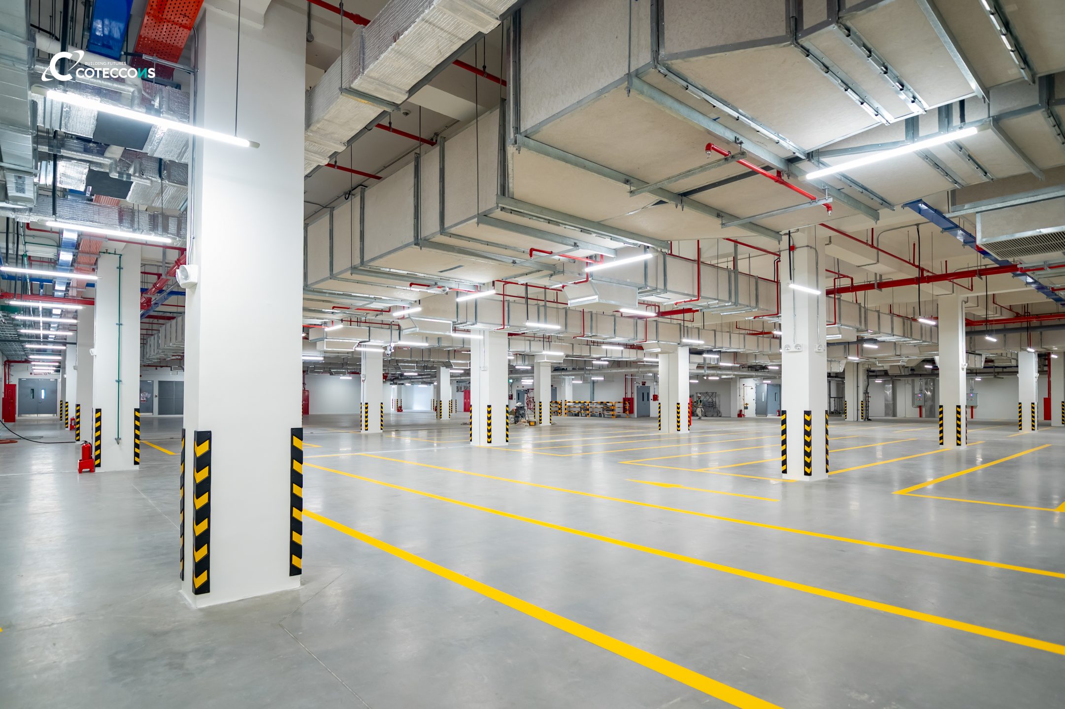 Một trong những hạng mục đặc biệt là sàn mài “polished concrete” – loại sàn bê tông được xử lý bằng máy móc chuyên dụng và hóa chất để tạo bề mặt siêu phẳng, nhẵn mịn, sáng bóng, có độ cứng và độ bền cao. Đề bài khó mà Chủ đầu tư đưa ra nằm ở độ đồng đều của hạt đá sau khi mài lộ bề mặt, khi đá trong bê tông vốn được trộn và phân bố hoàn toàn ngẫu nhiên, không thể kiểm soát vị trí từng hạt. Coteccons đã nghiên cứu, thử nghiệm nhiều phương án thi công và kiểm soát chặt chẽ từng công đoạn, từ đó hoàn thành được yêu cầu của chủ đầu tư, kiểm soát độ bóng và đồng đều trên diện rộng.