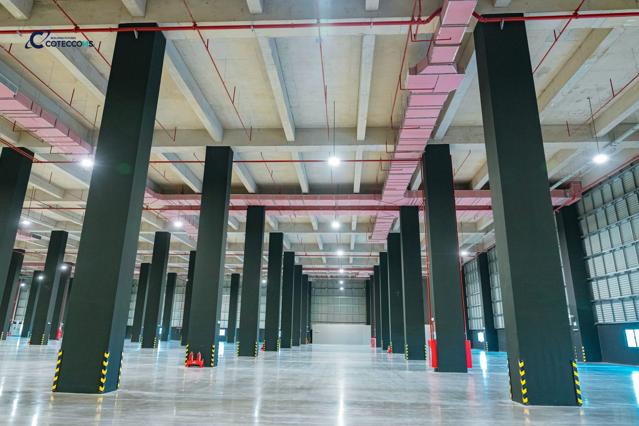 Ngay từ giai đoạn đầu, đội ngũ kỹ sư Coteccons đã phân tích chi tiết kết cấu chịu tải tĩnh và động do xe nâng, container và phương tiện vận tải hạng nặng vận hành để đưa ra biện pháp kỹ thuật tối ưu nhất. Hệ chống Ringlock được triển khai, đảm bảo an toàn, rút ngắn tiến độ. Hệ thống phòng cháy chữa cháy tự động cũng được Coteccons thiết kế và thi công đồng bộ theo tiêu chuẩn quốc tế, tích hợp cảm biến nhiệt, đầu phun sprinkler và hệ thống cảnh báo thông minh, đáp ứng các yêu cầu nghiệm thu khắt khe của cơ quan chức năng và chủ đầu tư.