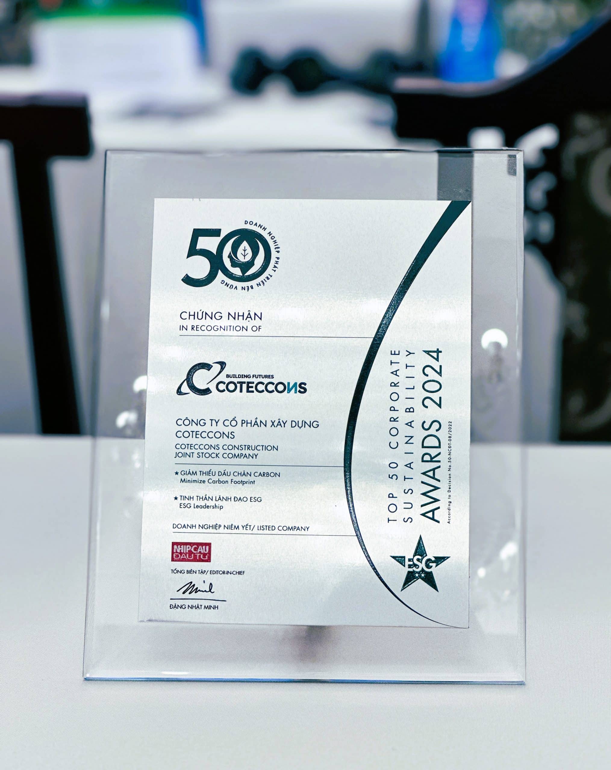 Hồ Chí Minh, ngày 2/8/2024 – Công ty Cổ phần Xây dựng Coteccons (HOSE: CTD) tự hào được vinh danh trong danh sách “Top 50 doanh nghiệp phát triển bền vững (Top50 CSA)” do Tạp Chí Nhịp Cầu Đầu Tư tổ chức tại hai hạng mục quan trọng: E – Giảm thiểu dấu chân carbon và G – Tinh thần lãnh đạo ESG. Giải thưởng này ghi nhận những nỗ lực không ngừng của Coteccons trong việc tiên phong trên tinh thần đổi mới sáng tạo trong thực hành ESG (Môi trường, Xã hội và Quản trị).