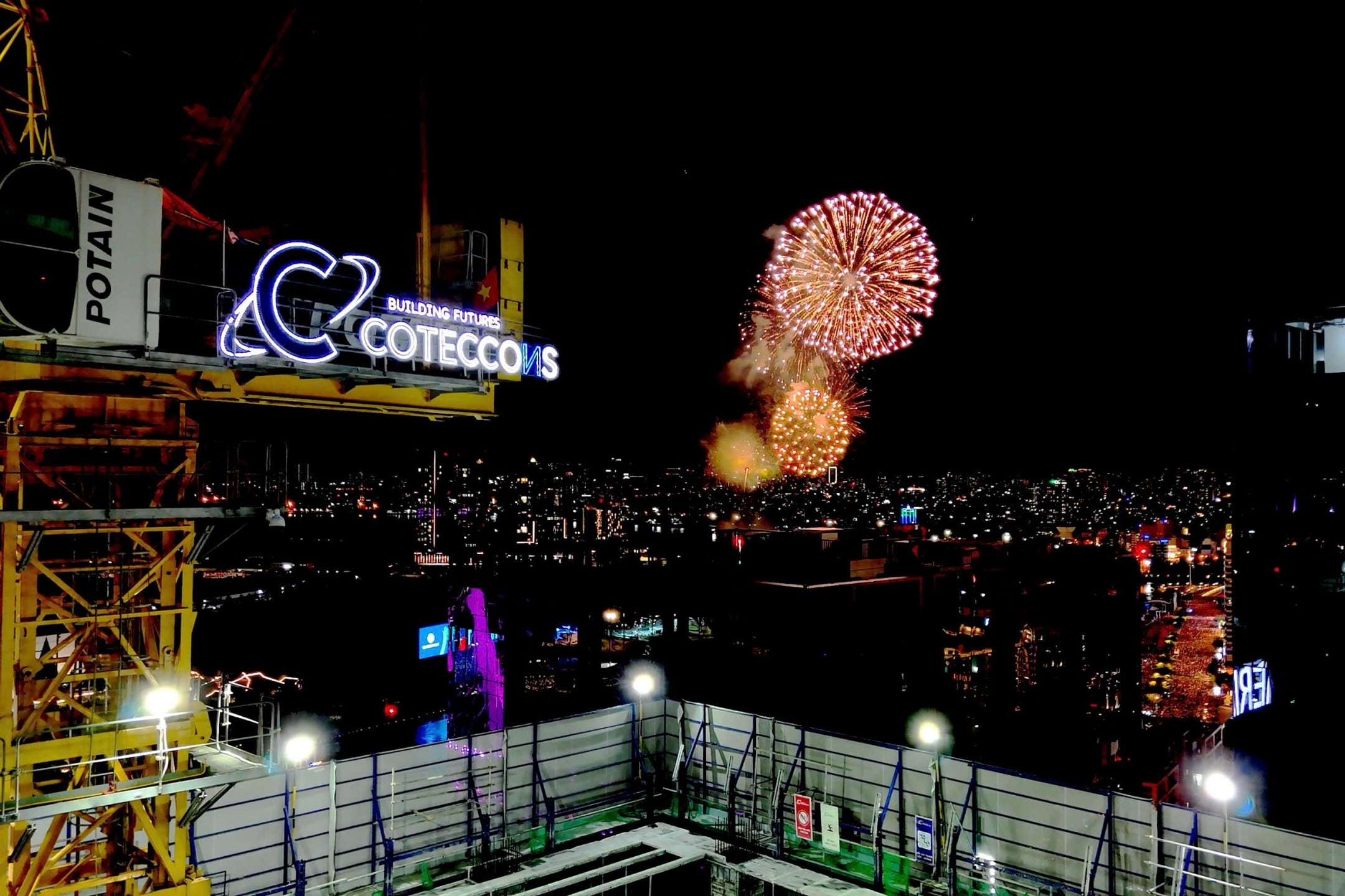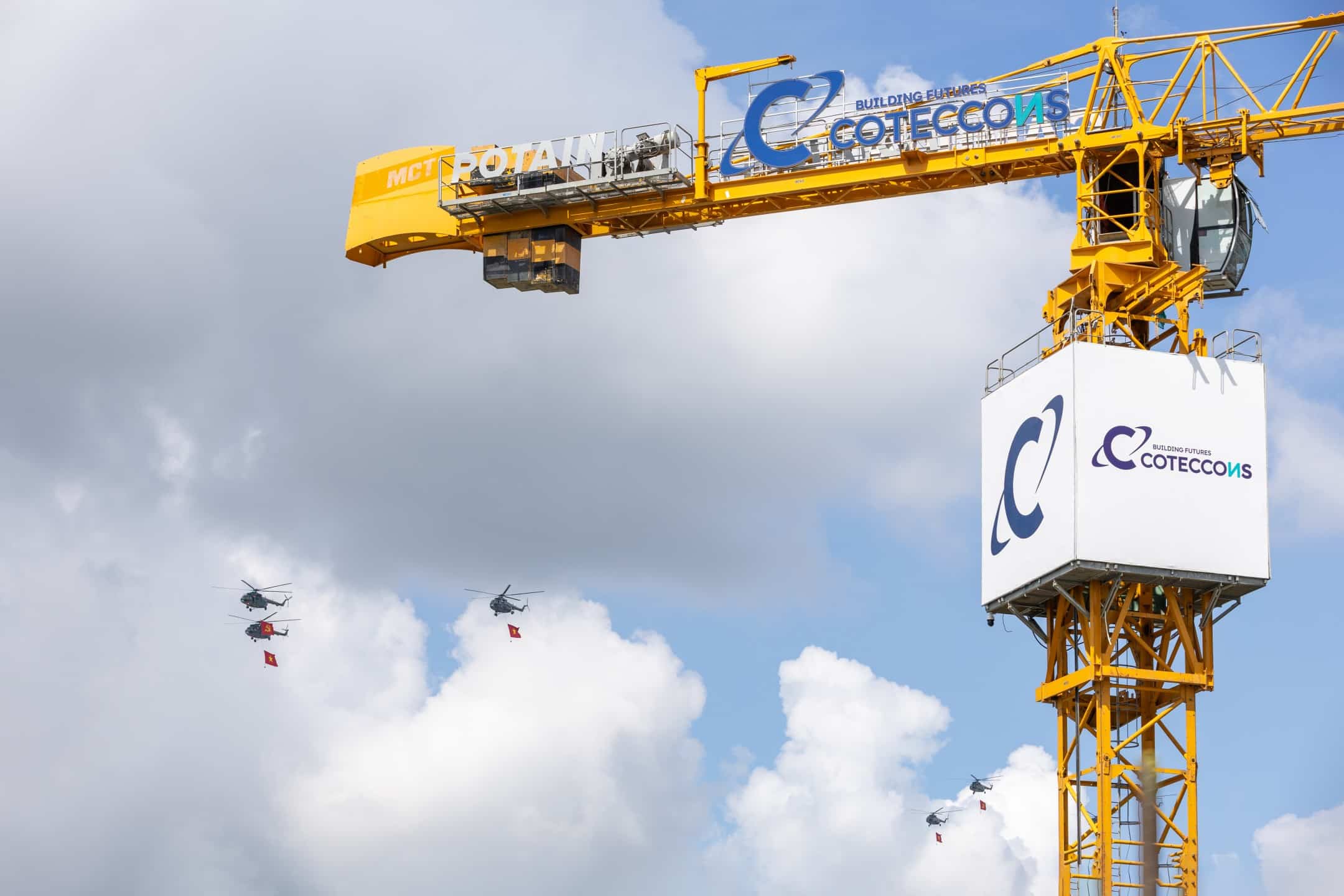 As April arrives, Coteccons construction sites across the country — from highlands to lowlands, urban centers to coastal regions — are adorned with the vibrant red of the national flag flying proudly atop tower cranes, scaffolding, and at site entrances. Among the most moving moments are those when the Vietnamese flag is flown across the sky by aircraft, right above the very structures taking shape, leaving a lasting and powerful impression.