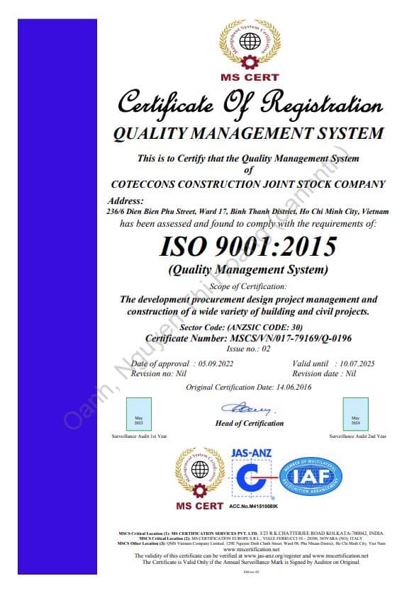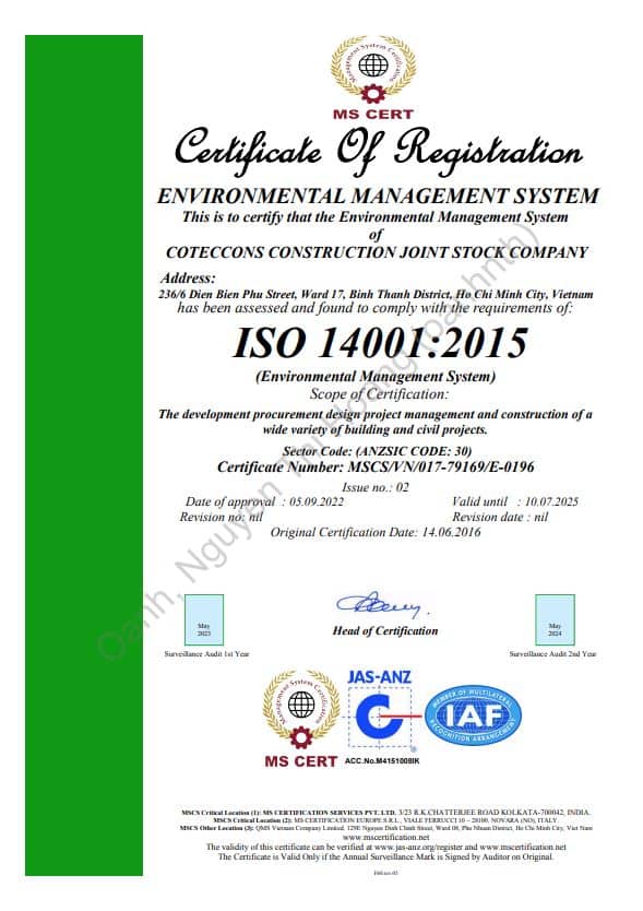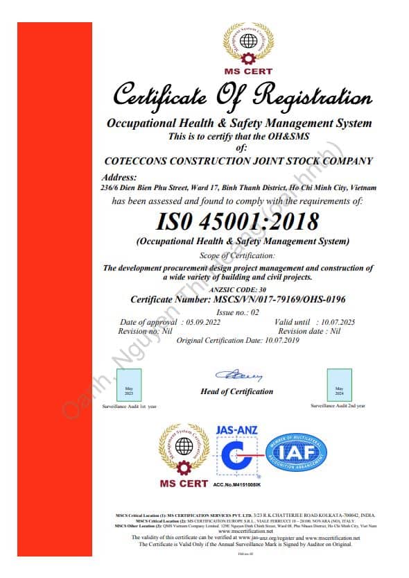 OUR HSE team, with local and international experience in large-scale projects, is leading with an excellent record within the industry for safety work hours. The safety management system at Coteccons operates according to ISO 45001:2018 - Occupational health and safety management system and ISO 14001 - 2015 - Environmental management system. Safety and quality controls are strictly followed to ensure the safe operation and control of construction activities: