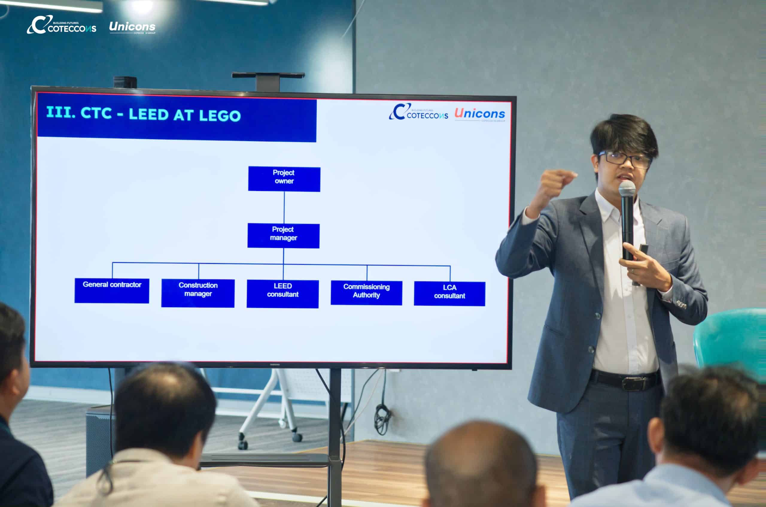 With a view to enhancing our position to the international standard and competitive capacity in the global market, we follow the path of ESG by our own choice. We are committed to reducing our environmental impacts through sustainable practices. We prioritize energy efficiency, low-carbon emissions, responsible waste management and resource conservation to promote a greener future for all. The commitment of Coteccons Group towards doing sustainable and environmentally friendly business is demonstrated through the completion of numerous projects that have acquired LEED Certificate (Leadership in Energy and Environmental Design). We have a total of 38 projects meeting the standard, namely: LEGO Binh Duong Factory (Platinum), President Place (Gold), Jotun Vietnam Greenfield (Gold), Porsche Center Saigon II (Gold), Diamond Lotus Riverside (Gold), Lancaster Luminaire (Gold), Diamond Crown Hai Phong (Gold), Tetra Pak Binh Duong (Gold), Regina Miracle International Vietnam Factory (Silver), Coca-Cola HCM Site Master Plant (Silver), Marigot Jewlery Vietnam Factory (Silver), PepsiCo Bac Ninh Factory (Silver), etc.