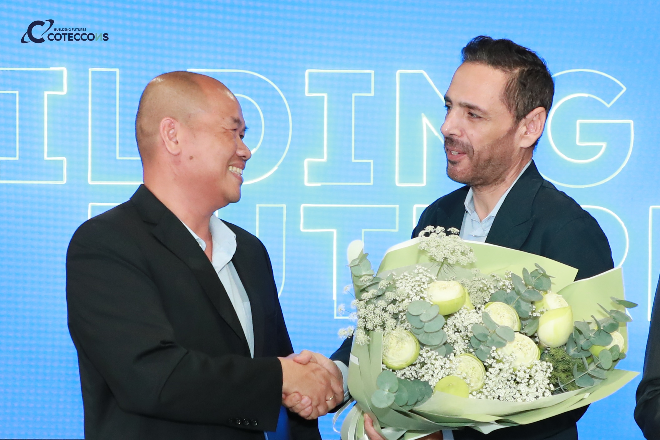 (Ông Chris Senekki – Chủ tịch Unicons, Phó Tổng giám đốc Coteccons trao tặng hoa chúc mừng Ông Trần Văn Lâm)